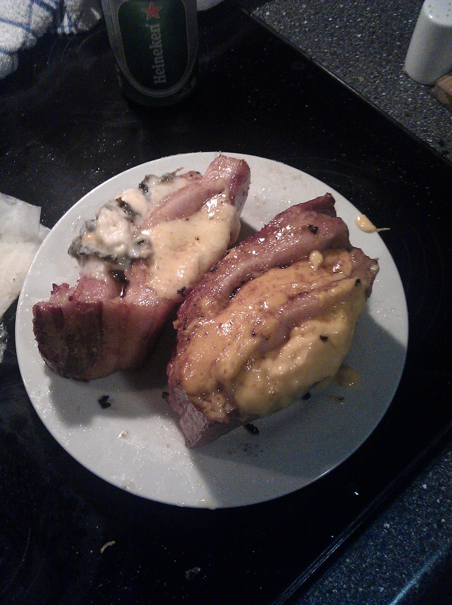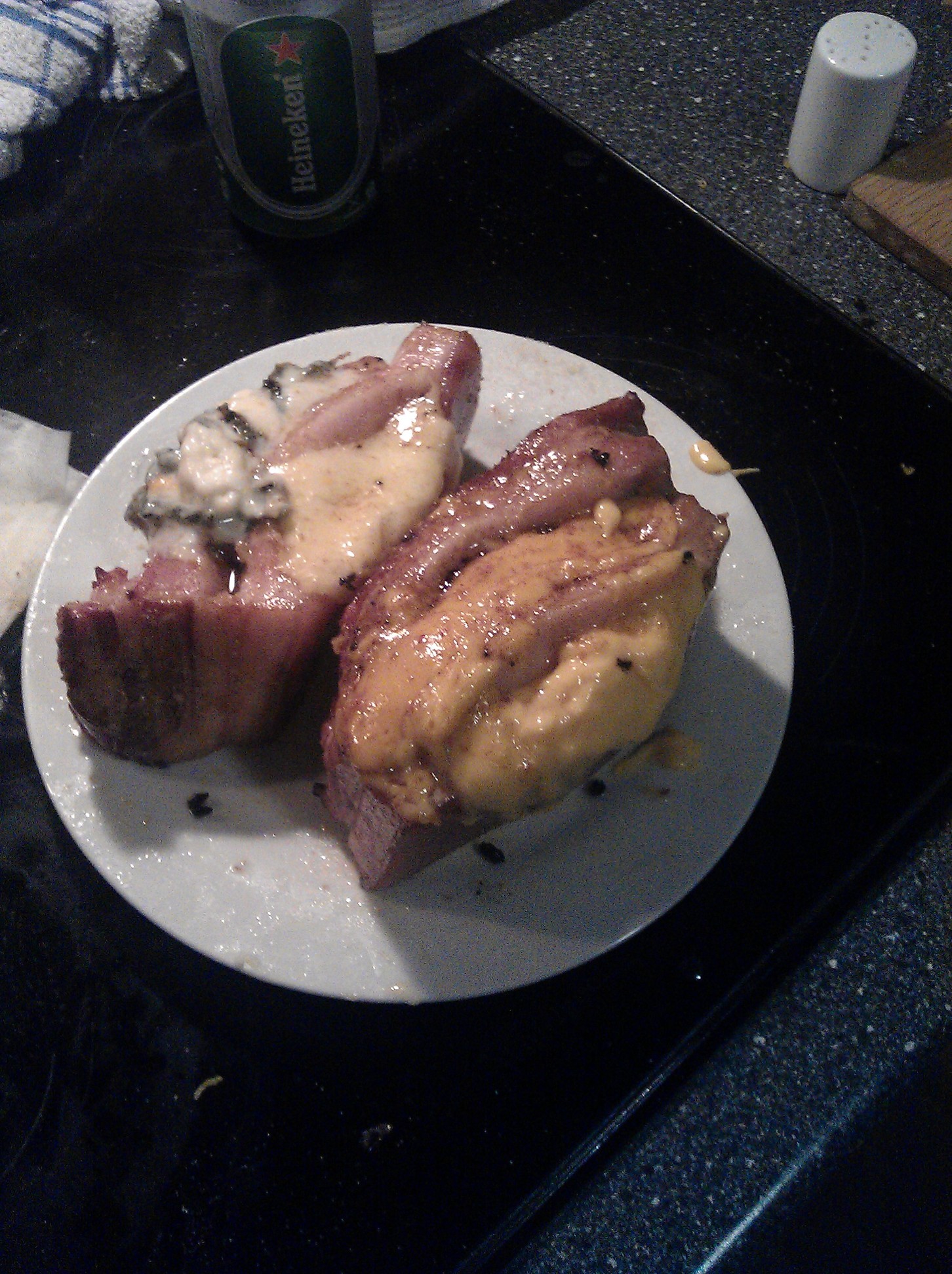 Oven baked paprika filled with bacon, garlic, cheese and butter
