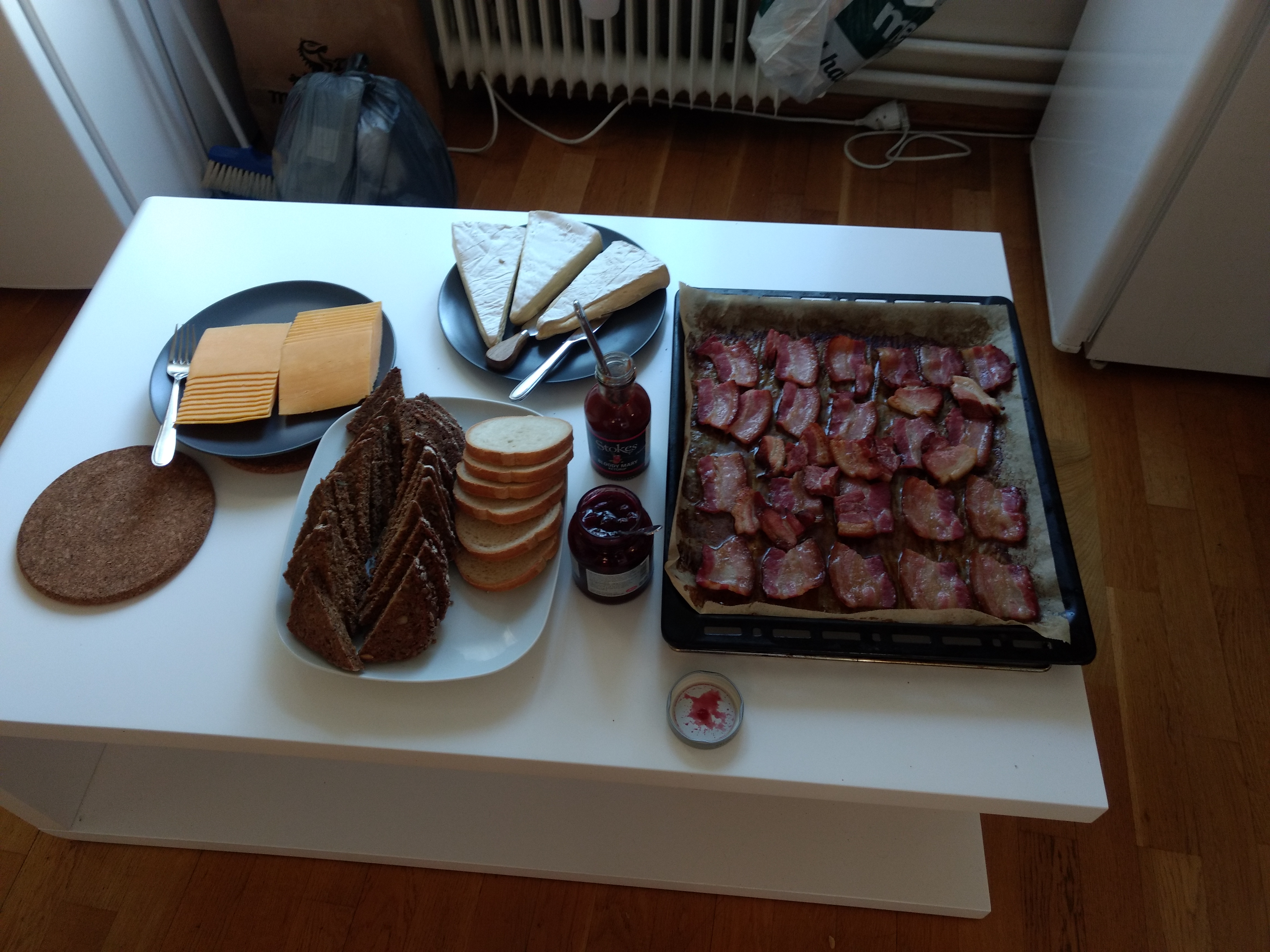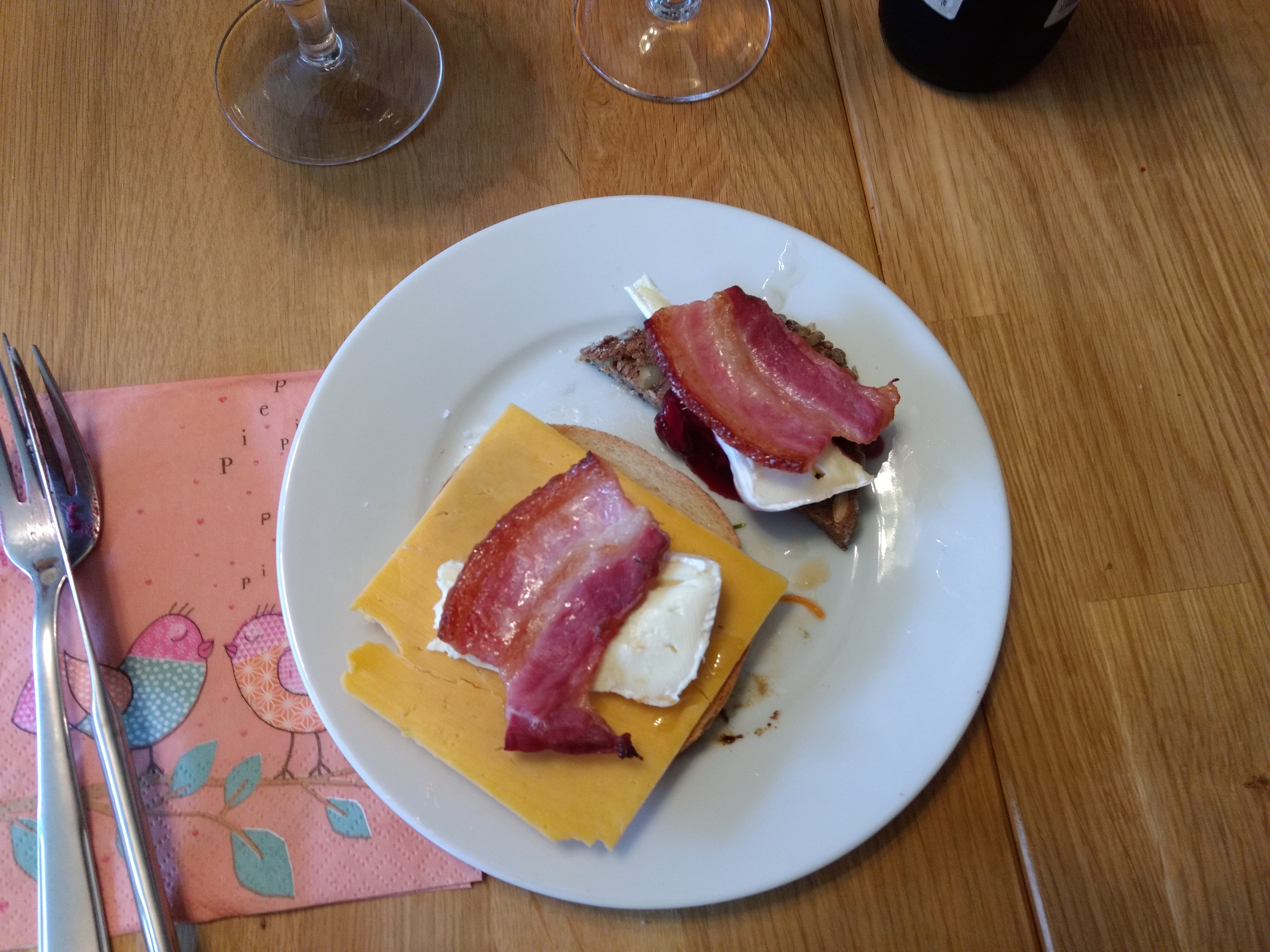 Bacon, danish rye bread, cherry jam and brie